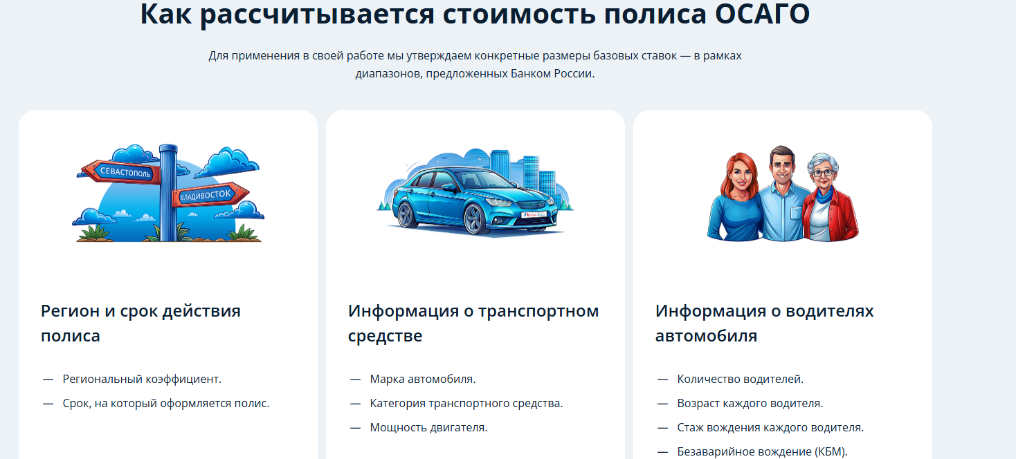 Цена ОСАГО зависит от нескольких факторов. Вы можете обратиться к нам для просчета (бесплатно)