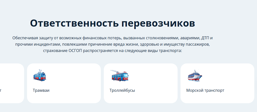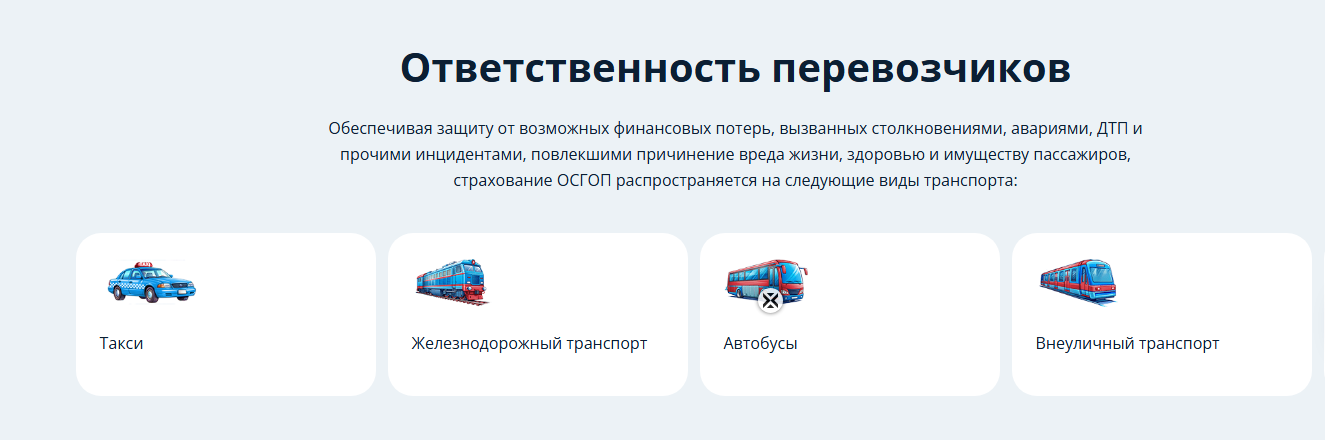 Обязательное страхование гражданской ответственности перевозчиков (ОСГОП) пассажиров обеспечивает защиту от возможных страховых событий, вызванных авариями или несчастными случаями, которые могли произойти с пассажирами в дороге.