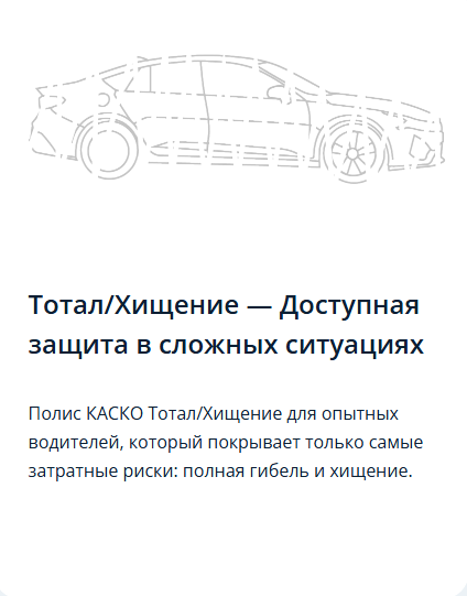 Полис КАСКО Тотал/Хищение для опытных водителей, который покрывает только самые затратные риски: полная гибель и хищение.